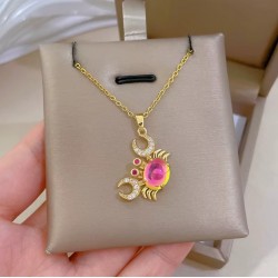 Un collar que captura la energía del verano. Este delicado collar presenta un colgante en forma de cangrejo con una piedra central multicolor efecto cristal, acompañado de circonitas que aportan brillo sutil.