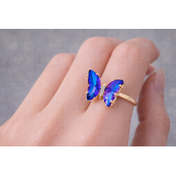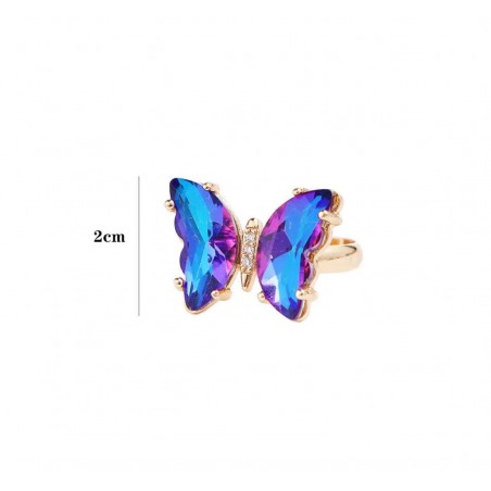 Anillo autoajustable con mariposa en cristal azul degradé y detalles de brillo al centro. Talla única ajustable, ideal para looks Coreano y regalos.