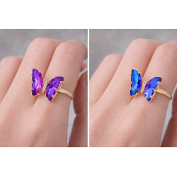Color, brillo y un diseño que destaca. Este anillo mariposa en cristal morado degradé es perfecto para elevar cualquier look con un toque femenino y moderno.